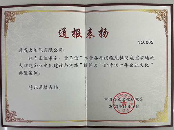 11月16日,由中國企業(yè)文化研究會主辦,以“總結(jié)新時(shí)代十年企業(yè)文化 探索數(shù)字化轉(zhuǎn)型文化路徑”為主題的第二十屆中外企業(yè)文化峰會于南京隆重召開,會上宣讀了新時(shí)代十年企業(yè)文化典型經(jīng)驗(yàn)、典型案例、先進(jìn)經(jīng)驗(yàn)和2023年度課題研究成果的表揚(yáng)決定,通威太陽能獲評“新時(shí)代十年企業(yè)文化”典型案例。