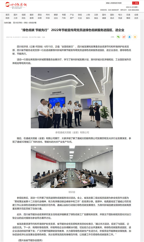 6月17日,中國(guó)新聞網(wǎng)、四川經(jīng)濟(jì)網(wǎng)等媒體以“2022年節(jié)能宣傳周黨員送綠色低碳服務(wù)走進(jìn)成都淮州新城”為題,聚焦通威太陽能金堂基地節(jié)能宣傳周活動(dòng)。