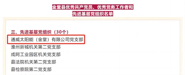 通威太陽能(金堂)有限公司黨支部榮獲淮州新城“兩優一先”多項榮譽