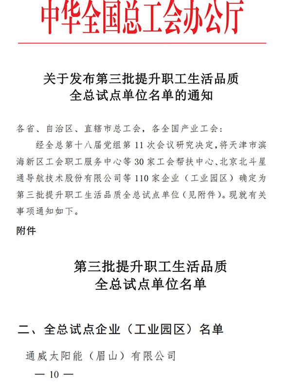 通威太陽能眉山基地獲評全國“塑造職工幸福生活幸福環境企業”試點單位