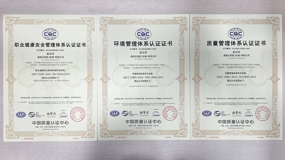 通威太陽能安徽公司榮獲CQC管理體系認證證書