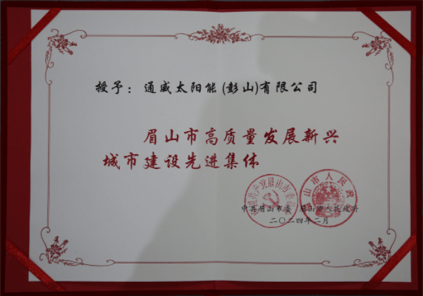 近日,通威太陽能(彭山)公司被授予“眉山市高質量發展新興城市建設先進集體”的榮譽稱號。這一榮譽不僅凸顯了彭山公司在眉山天府新區的杰出表現,也充分展示了彭山公司在推動眉山市高質量發展和新興城市建設方面邁出的堅實的步伐和取得的顯著成就。
