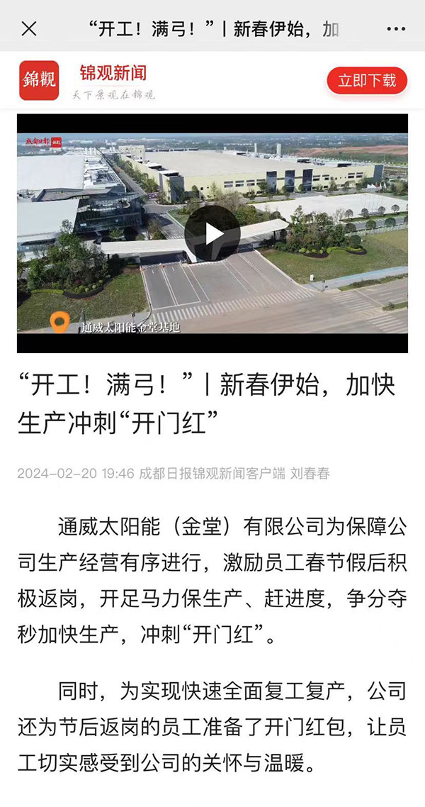 擼起袖子加油干,力爭龍年開門紅!2月20日,成都日報以“開工!滿弓!”為題,聚焦通威太陽能春節節后復工復產生產場景,獲得人民網、四川新聞網等多家主流媒體轉載報道。