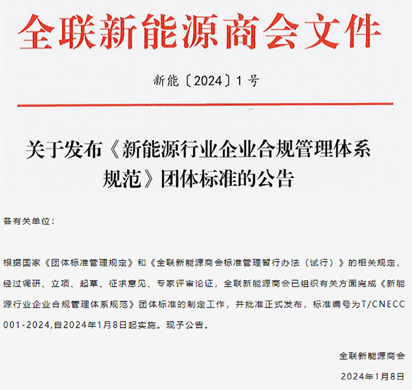 近日,團體標準《新能源行業(yè)企業(yè)合規(guī)管理體系規(guī)范》已正式實施,本規(guī)范由全國工商聯(lián)合會新能源商會牽頭組織編寫,通威太陽能作為企業(yè)代表參與編寫。此前,公司已就該標準與組織方進行了多輪專題會議討論、提出完善建議、反復(fù)修改。本次團體標準的參與編寫,充分彰顯了公司作為新能源企業(yè)的社會責(zé)任,為行業(yè)的合規(guī)建設(shè)、規(guī)范發(fā)展貢獻企業(yè)力量。