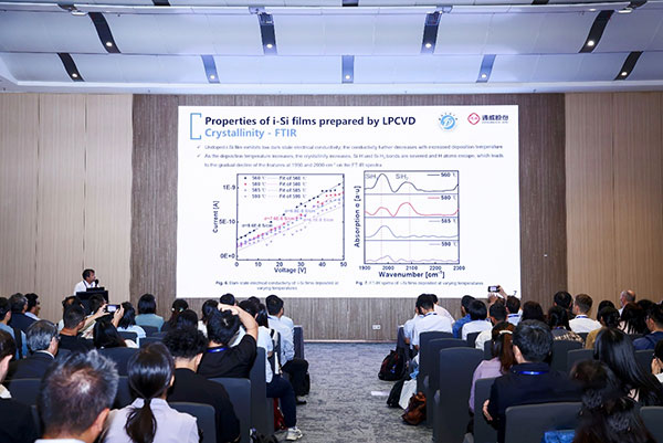 孟夏杰部長作題為《Effective boron doping of LPCVD deposited intrinsic silicon》(LPCVD技術沉積本征硅的有效硼摻雜)專題演講,分享了通威對硼摻雜多晶硅的技術研究,使用BCl3對本征非晶硅進行摻雜,通過控制沉積溫度和退火有效控制多晶硅晶粒有效硼摻雜,硼擴散后的p+多晶硅表現出良好的鈍化性能和低的接觸電阻,以此技術應用可推進TBC電池技術研發。目前通威在TBC技術研發已具備完善的研究中心及試驗線,TBC研發效率p型達到了25.41%,n型達到26.5%,遠超行業平均水平。
