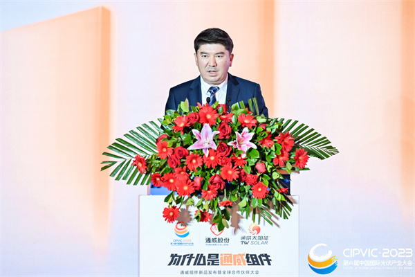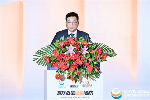 通威股份光伏商務部組件全球營銷總經理邱新在致辭中首先對蒞臨現場的領導嘉賓致以衷心的感謝,并表示,今年是通威入局組件的第一個自然年,這一年的發展離不開廣大伙伴的支持,也離不開這個沉淀定力的時代。時代為何選擇通威?選擇通威就是選擇高效、選擇誠信和選擇可靠。高效、誠信、可靠架起了合作交流的橋梁,也為共同建設綠色能源的未來、共同奔赴更美好的生活的提供了更多的選擇路徑。真誠期待與廣大行業同仁繼續攜手同行,共謀合作新篇,共繪興業愿景。