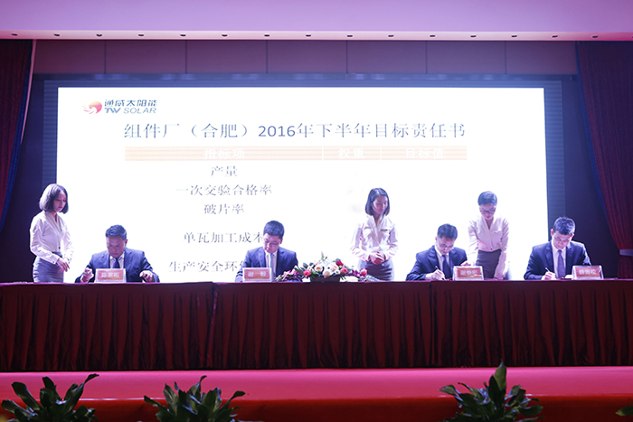 會議上,通威太陽能(合肥、成都)有限公司首席財(cái)務(wù)官周丹、高級副總裁張忠文、高級副總裁路廣軍首先從各自分管的部門工作出發(fā),結(jié)合市場競爭現(xiàn)狀,總結(jié)了上半年取得的成績,強(qiáng)調(diào)了下半年努力的方向和期望達(dá)成的目標(biāo)。通威太陽能(合肥、成都)有限公司首席運(yùn)營官謝泰宏、高級副總裁陳家彬、高級副總裁張冠綸、采購部部長薛青松分別就產(chǎn)供銷和研發(fā)體系進(jìn)行了總結(jié)計(jì)劃述職。隨后,產(chǎn)供銷三個(gè)系統(tǒng)分別與謝董事長簽訂了下半年年度目標(biāo)責(zé)任書。