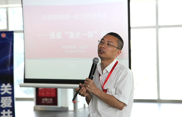 光伏事業(yè)部部長盧銘凱與大家分享了世界一流光伏企業(yè)在技術,市場等方面的現(xiàn)狀及關鍵數(shù)據(jù),重點介紹了通威光伏產(chǎn)業(yè)的發(fā)展及現(xiàn)狀。隨后,市場營銷部經(jīng)理胡顯軍從通威的發(fā)展、企業(yè)文化入手,向大家詳述了通威 “漁光一體”項目的意義及推進情況。