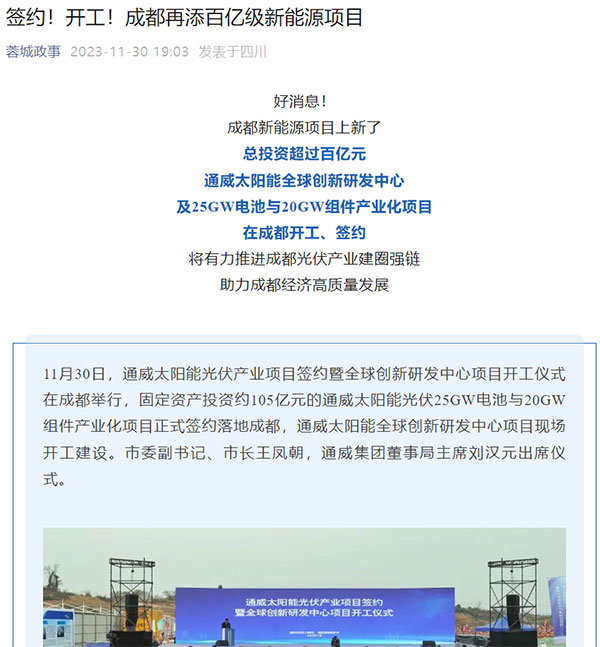 報道指出,11月30日,通威太陽能光伏產業項目簽約暨全球創新研發中心項目開工儀式在成都舉行,固定資產投資約105億元的通威太陽能光伏產業化項目正式簽約落地成都,通威太陽能全球創新研發中心項目現場開工建設。一直以來,通威立足成都、深耕光伏,從‘跟跑’‘并跑’到‘領跑’的跨越式發展歷程,也是成都光伏產業從有到強的發展歷程,光伏產業建圈強鏈已成為成都綠色低碳發展的重要支撐。