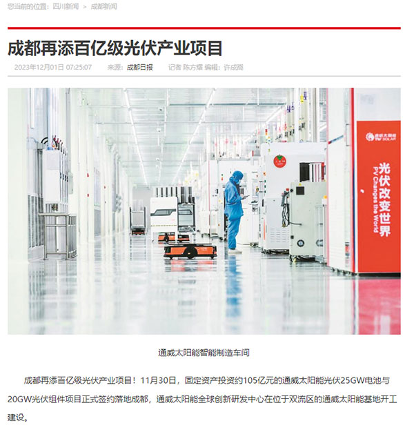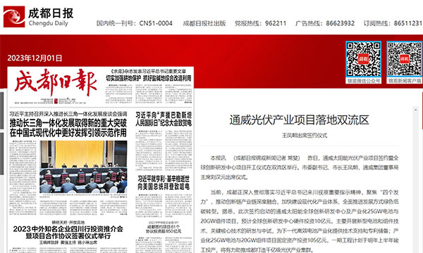 成都日報聚焦通威太陽能