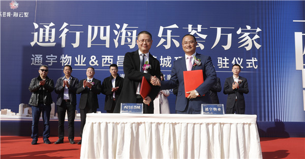 11月30日,成都通宇物業管理有限公司入駐西昌樂薈城項目簽約儀式在西昌邛海之濱隆重舉行。西昌市房管局副局長李曉明,西昌市高枧鄉派出所所長楊正鵬,中國銀行涼山州分行副行長張曉東,西昌市農業銀行副行長林媛,浙商銀行涼山分行行長趙之熠,通威集團副總裁、西昌華地恒通投資有限公司董事長管亞偉,通威集團副總裁黃其剛,通宇物業總經理孫斌,西昌樂薈城營銷總監邱晉等領導出席活動。西昌樂薈城業主代表,通宇物業、樂薈城員工代表,以及權威主流媒體近200人現場見證了這一重要時刻。