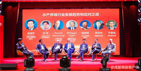 在桂建芳院士主持的圓桌對話環節,中國水產科學研究院副院長鄧偉、丹麥拜歐瑪集團副總裁Henrik、比利時英偉水產集團全球總裁Philippe Léger、江蘇中洋集團董事長錢曉明、通威股份總裁郭異忠、澳華集團總裁許愿斌等嘉賓,圍繞水產行業發展趨勢和應對之道展開“論劍”,新思路、新觀點的智慧碰撞引發現場熱烈掌聲。